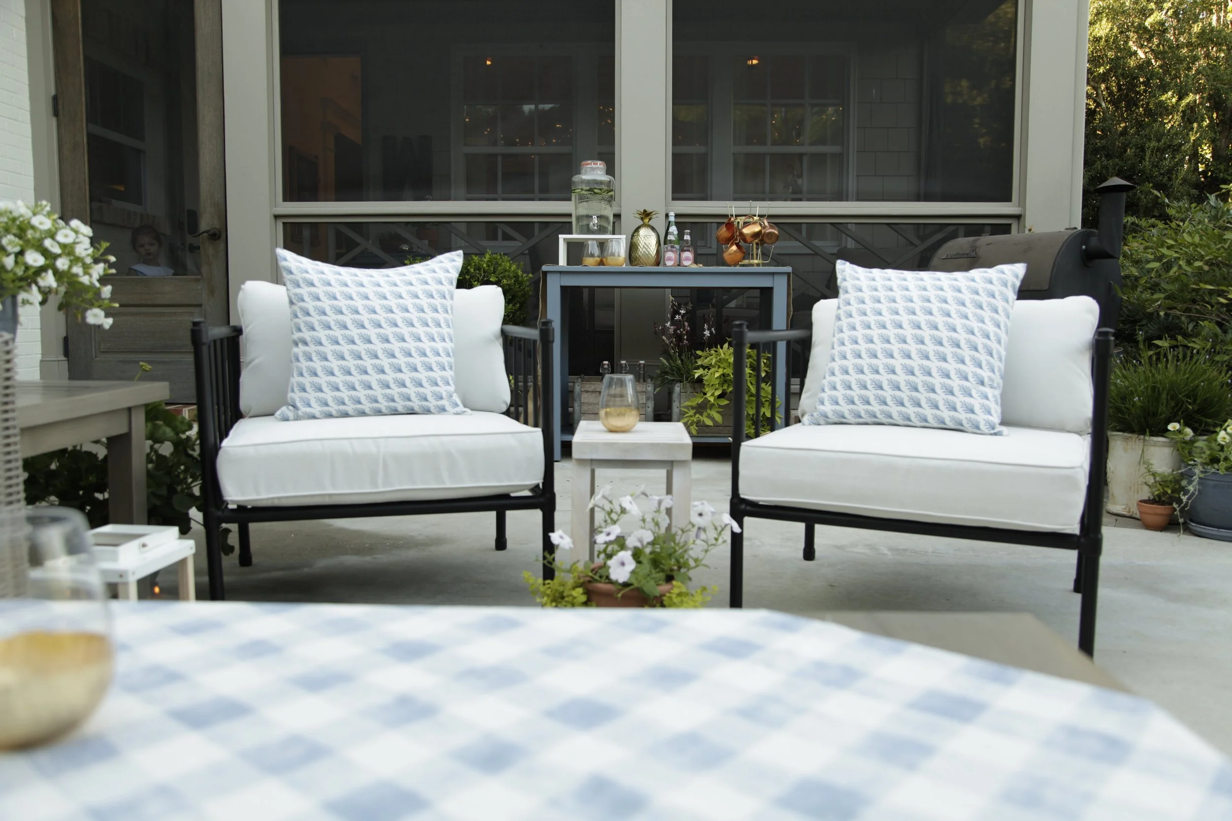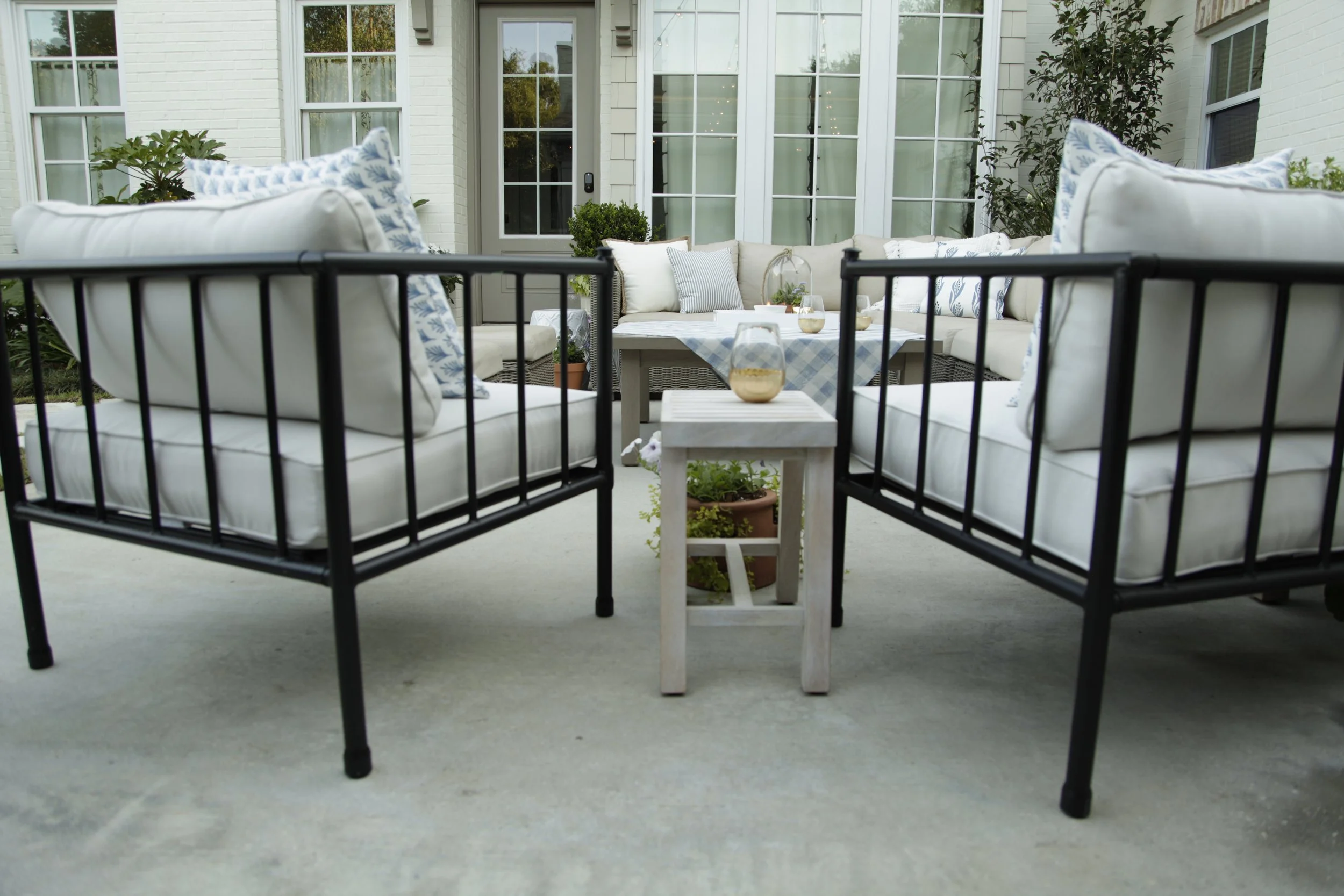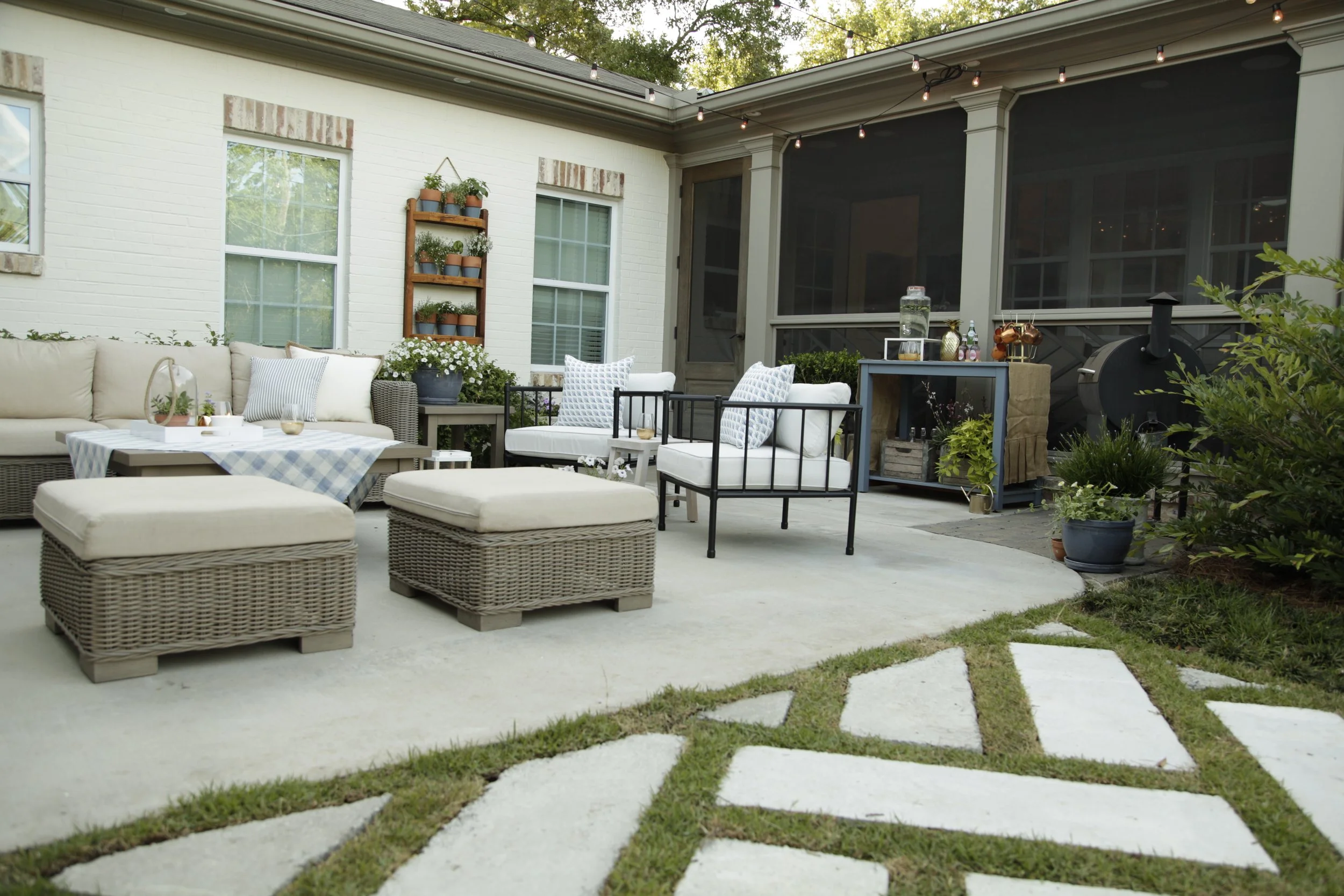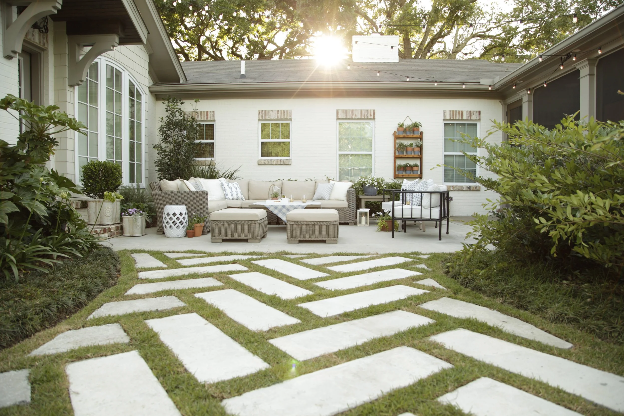 We created this one of a kind oversized herringbone walkway to create a transition from the back yard onto their styled patio.